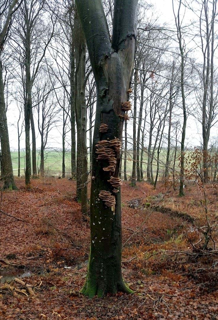 Koralpigsvamp på døende træ på Gyllingnæs. Svampen er rødlistet som værende næsten truet (NT).