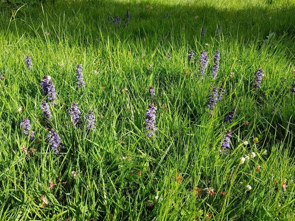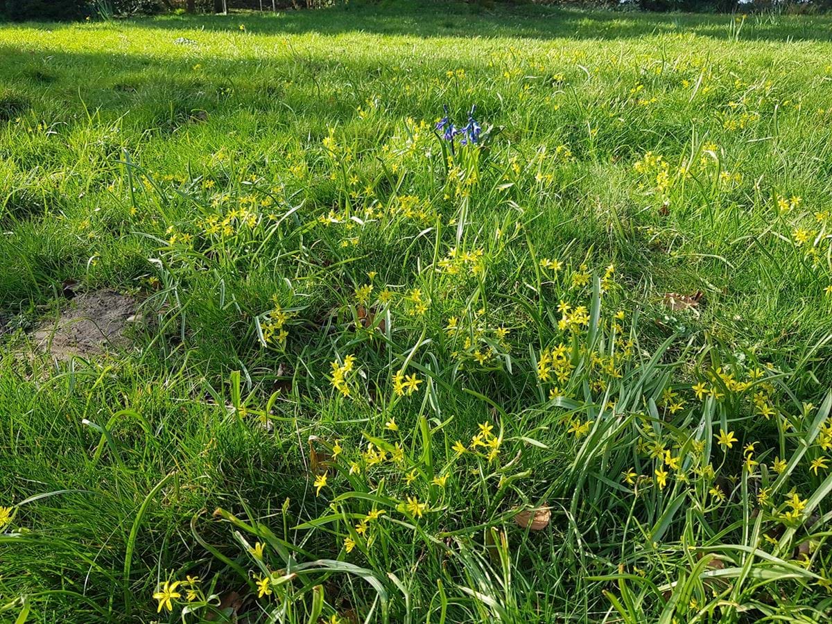 Blomstrende forårsplæner med guldstjerne og krybende læbeløs giver føde til bestøverne