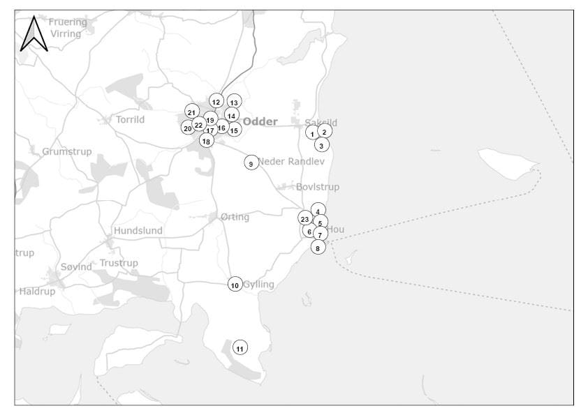 For Hou og det vestlige Odders vedkommende er der også en risiko på grund af stigende grundvand, som ikke er medtaget i figuren.