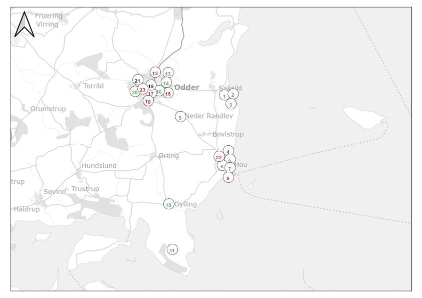 Figur 2.19: Fordeling af røde og grønne risikoområder i Odder Kommune.
