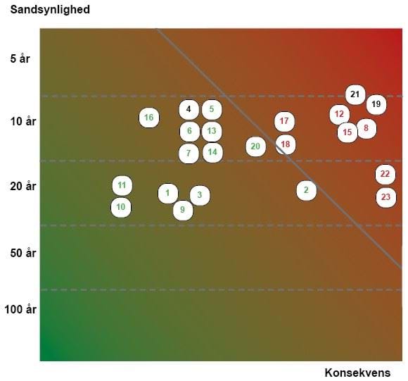 Figur 2.17: Risikomatrice med risikoområderne prioriteret i forhold til konsekvens og sandsynlighed.