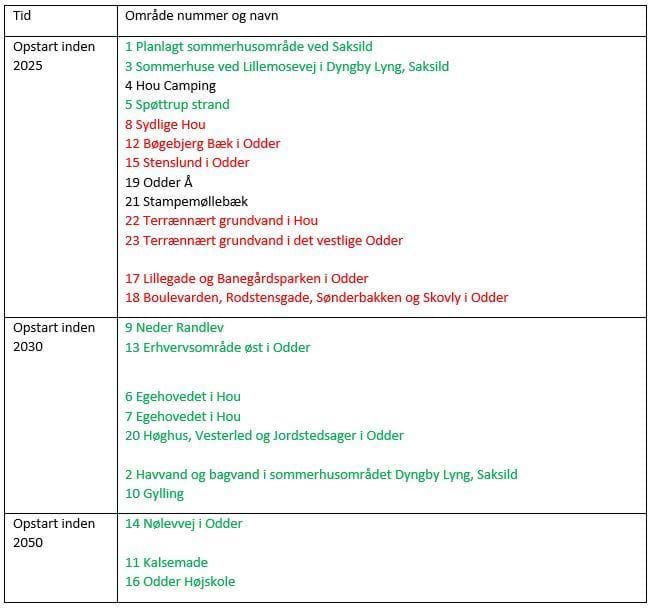 De 7 indsatsområder er udvalgt, da der er risiko for væsentlige gener for mennesker og værditab. Nogle steder er der fælleskloak med risiko for spildevand på terræn. Nogle steder er der en risiko for hændelser, som kan forekomme allerede i dag, mens der andre steder er en langsigtet risiko, som vil give mening at iværksætte undersøgelser af allerede nu. Det gælder f.eks. det terrænnære grundvand i Hou, nr. 22, og det vestlige Odder, nr. 23.