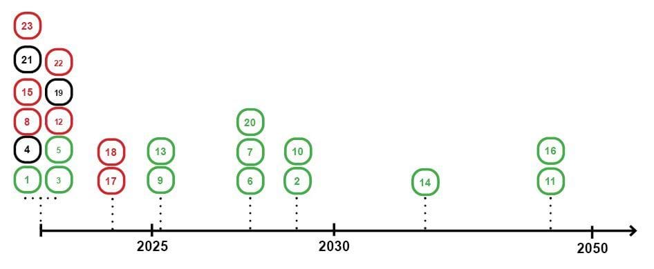Der er på baggrund af risikomatricen lavet en vurdering af, hvornår der skal ske en opstart af handlinger i hvert enkelt risikoområde, hvilket fremgår af Figur 2.18. Det er kun opstart af handlinger, som er vist, og ikke udstrækning af handlingen, da det på nuværende tidspunkt er uvist, hvor lang tid handlingerne strækker sig over.
