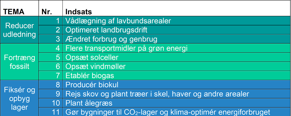 Indsatserne 1,2 og 3 er kategoriseret under tema 1 om reduktion af udledninger. Indsatserne 4 – 7 er kategoriseret under tema 2 om fortrængning af CO2 udledning mens indsatserne 8-11 tilhører tema 3 om at fiksere kulstof og dermed få begyndt på at rulle belastningen af klimaet tilbage. Der er et vist overlap for nogle handlingers vedkommende mellem flere temaer. F.eks. vil øget brug af elcykler og grøn offentlig transport, som skubber biler ud af transportsektoren både medvirke til at reducere energiforbrug, og dermed CO2-udledning OG brugen af grøn strøm som drivmiddel til både cykel og tog fortrænger fossil energi – og dermed CO2-udledning.