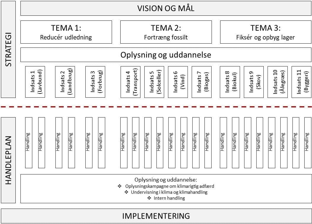 Figuren viser, hvordan Odder Kommunes samlede Energi- og klimastrategi er delt i en strategisk del (som beskrevet ovenfor) og en handlingsdel (beskrevet i det følgende). Indsatserne under de 3 temaer bliver således udmøntet i en handleplan med helt konkrete handlinger. Indsatserne er koblet til de konkrete mål som er beskrevet i afsnittet ”Vision og Mål”. Målsætningerne, som er grundlaget for Handleplanen er beskrevet i afsnit ang. hhv. de 21 handlinger og målsætningerne. Handlingerne er beskrevet i yderligere detalje i handleplanen til nærværende Strategiske Energi- og Klimaplan. I figuren er de bokse, der er udfyldt med handlepunkter kun illustrative – den udtømmende beskrivelse ligger i handleplanen til den Strategiske Energi- og Klimaplan. Til at understøtte de sektorkoblede handlinger er der lagt understøttende handling om oplysning og undervisning ind som en tværgående bjælke.