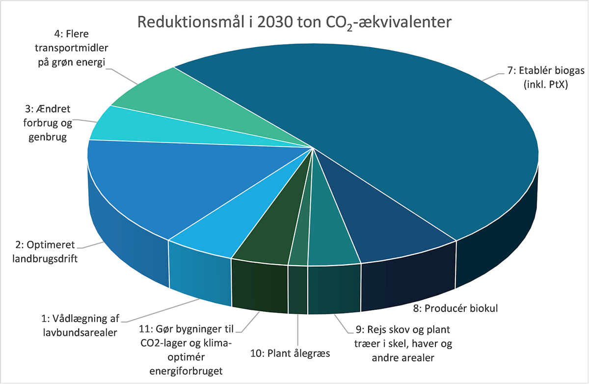 Derudover sætter kommunen mål i forhold til landbrug og arealanvendelse. Landbrug og arealanvendelse forventes at være de to mest klimabelastende sektorer i 2030 og 2050. Målene flugter med de forventninger der ligger i det nye landbrugsforlig. Sammensætningen af effekterne er illustreret i figuren nedenfor.