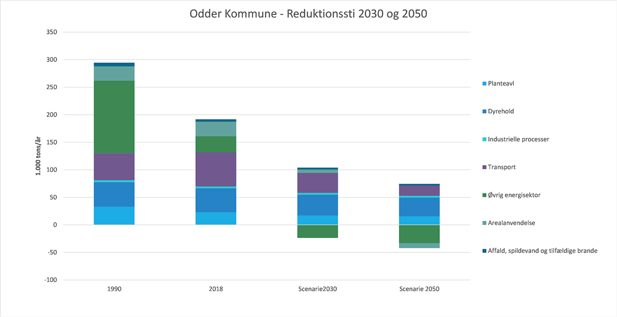 I 2030 vil der i Odder Kommune jf. reduktionsstien være gennemført så mange handlinger, at de energirelaterede udledninger (inkl. transport) vil være faldet til 13.000 ton CO2 pr. år. Tilsvarende medfører handlingerne på landbrugsområdet (særligt fikseringen af CO2 i biokul) massive reduktioner. Handlingerne resulterer samlet i reduktioner på 111.000 ton CO2-ækv. i 2030. Dette svarer til en reduktion på 73 % i forhold til 1990 (overopfyldelse af 70 %-målsætningen).