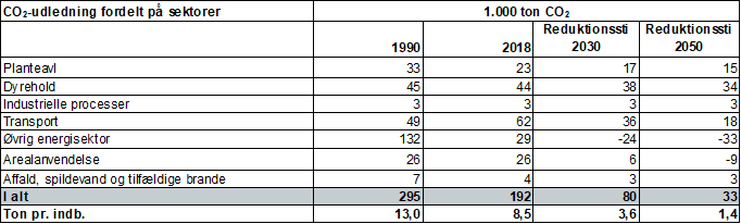 Nedenstående figur og tabel viser udviklingen i udledninger målt i CO2 ækvivalenter og inden for klimasektorerne som følge af den handlingsorienterede reduktionssti for Odder Kommune, som er beskrevet ovenfor.