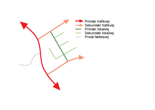 Vejklasserne anvendes efter et hierarkisk princip, hvor primære trafikveje forbindes til sekundære lokalveje via de mellemliggende vejklasser, som vist i figur herunder: