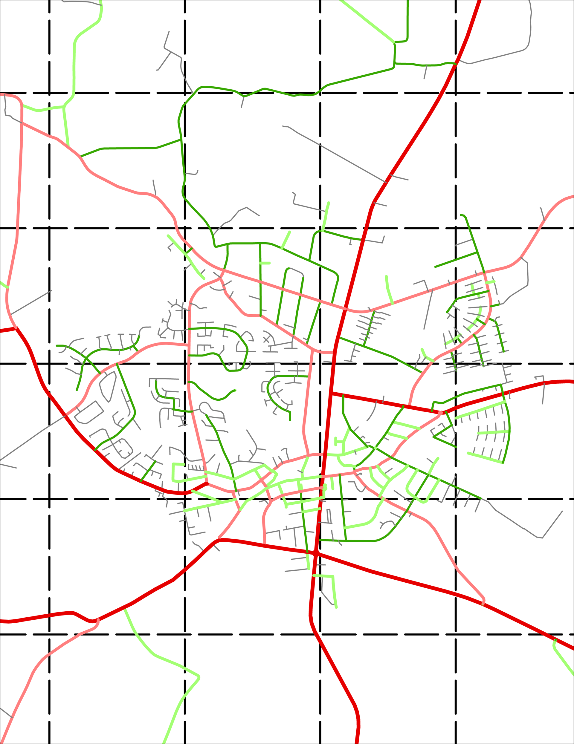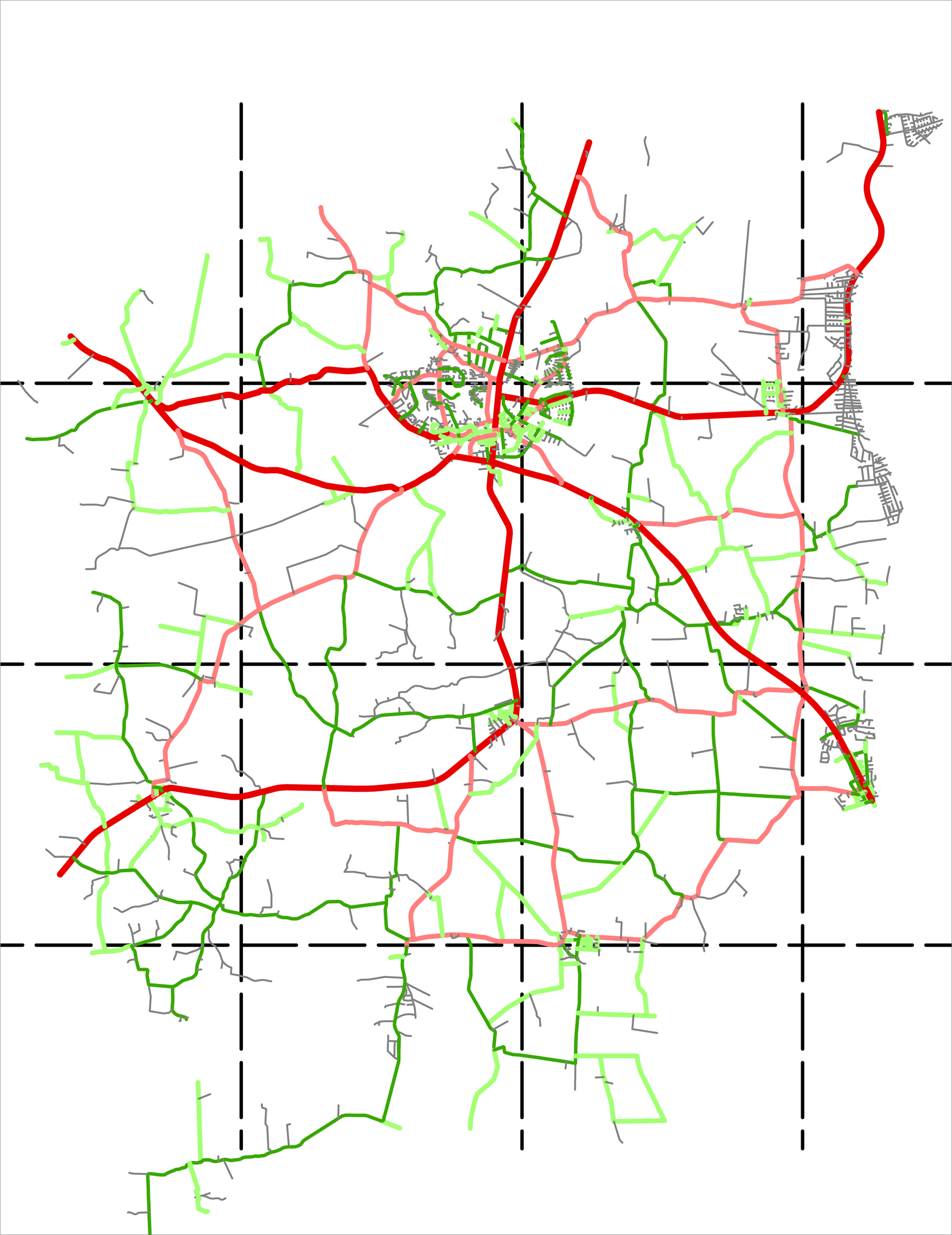 For Odder by er et udsnit af Vejklasseplanen vist i figuren herunder, her sammenlignet med en maskevidde på 1 km.