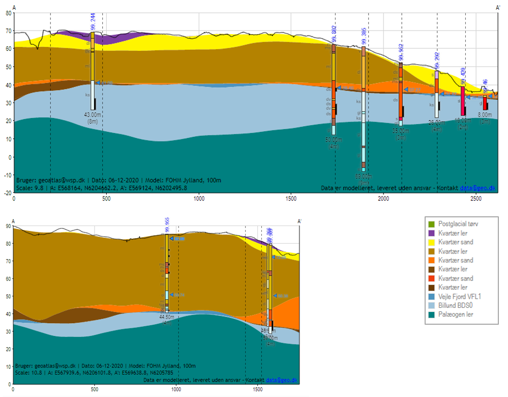 Figur 3.1. Profilsnit ved Fillerup (øverst) og Balle (nederst). De geologiske lag der er vist på profilet er fra ”FOHM modellen”, som er statens sammenstilling af alle geologiske modeller i Jylland, herunder også modellen ved Solbjerg-Fillerup. Terrænfladen i den oprindelige model passer ikke helt med det mere detaljerede terræn, der er anvendt i FOHM modellen, hvorfor lagene kan ligge både lidt over og lidt under terrænlinjen.