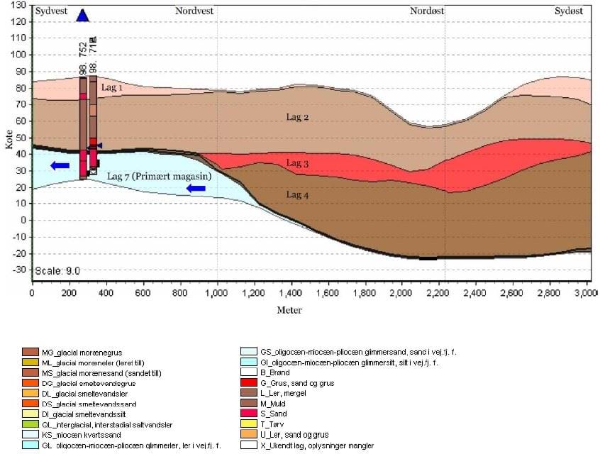 Figur 3.2. Profilsnit ved Torrild. Beskrivelserne af de forskellige jordtyper er signaturforklaring til de geologiske lag i boringerne. Profilsnit er fra statens redegørelsesrapport.