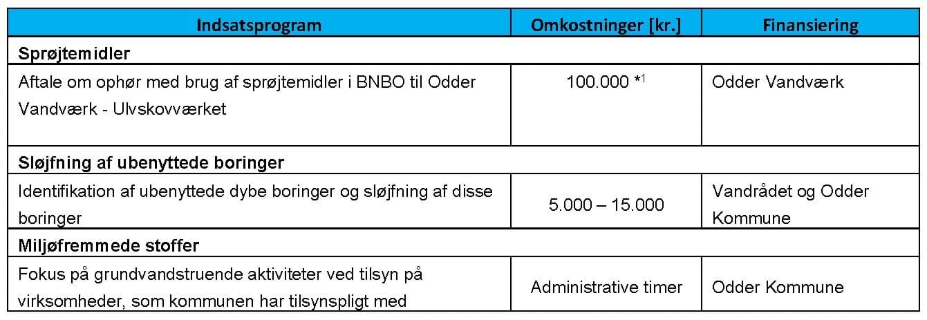 Ovennævnte indsatser vil dels medføre omkostninger for Odder Vandværk og dels administrative omkostninger for Odder Kommune til sagsbehandling. Hertil kommer eventuelle omkostninger til vandsamarbejdet i forbindelse med sløjfning af boringer, der ikke anvendes længere.